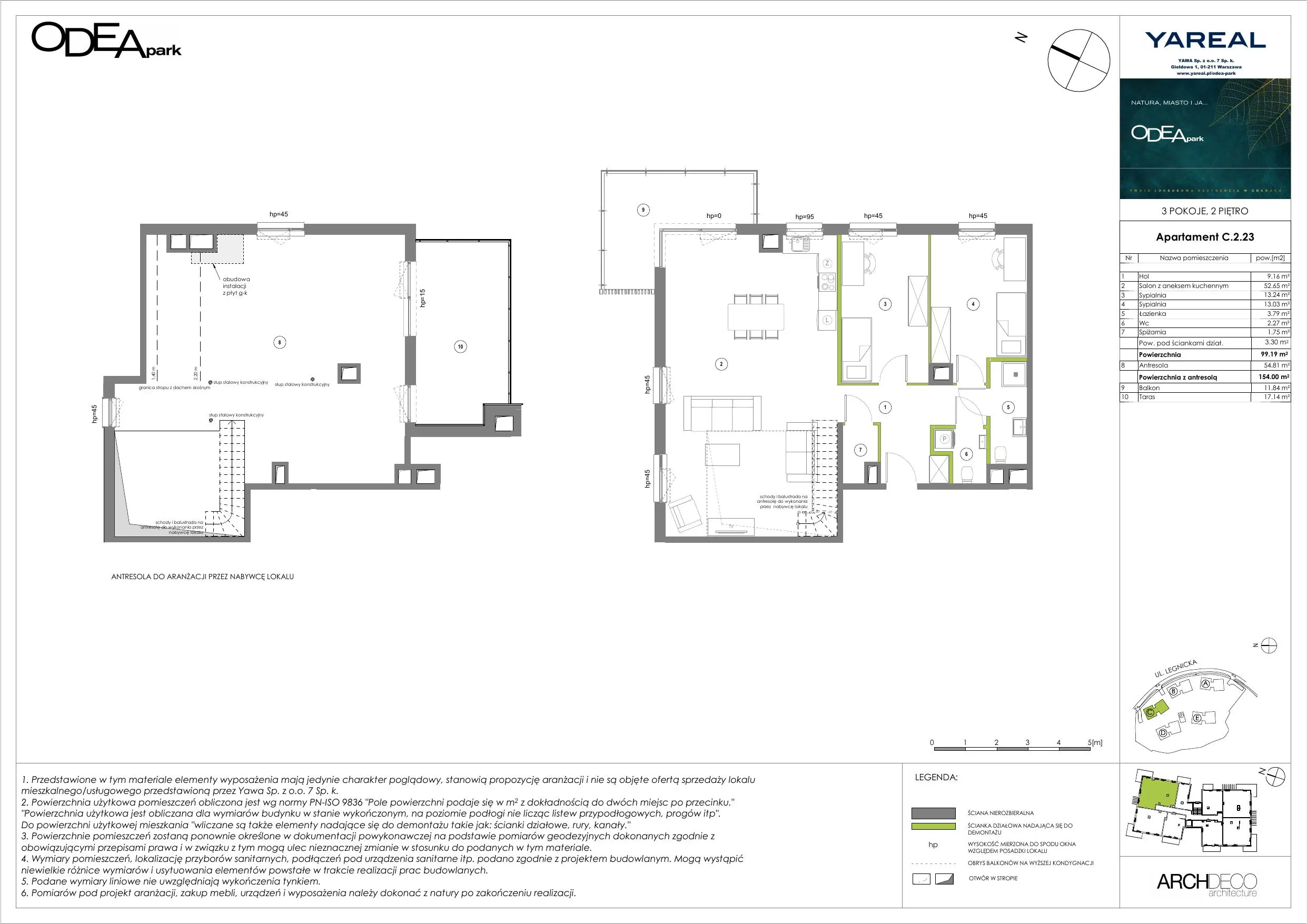 Apartament C.2.23 w ODEA Park Gdańsk to przestronne, dwupoziomowe mieszkanie, które daje swobodę aranżacji i wyraźne poczucie otwartości. 99,19 m2 części mieszkalnej uzupełnia 54,81 m2 antresoli, co pozwala elastycznie zaplanować strefy prywatne, wypoczynkowe lub do pracy. Lokal położony jest na 2. piętrze i posiada balkon 11,84 m2, okalający salon oraz osłonięty taras 17,14 m², tworzące dodatkową prywatną przestrzeń na świeżym powietrzu.
